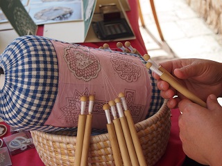 その途中に、ボビンレースを実演しているおばさまが。